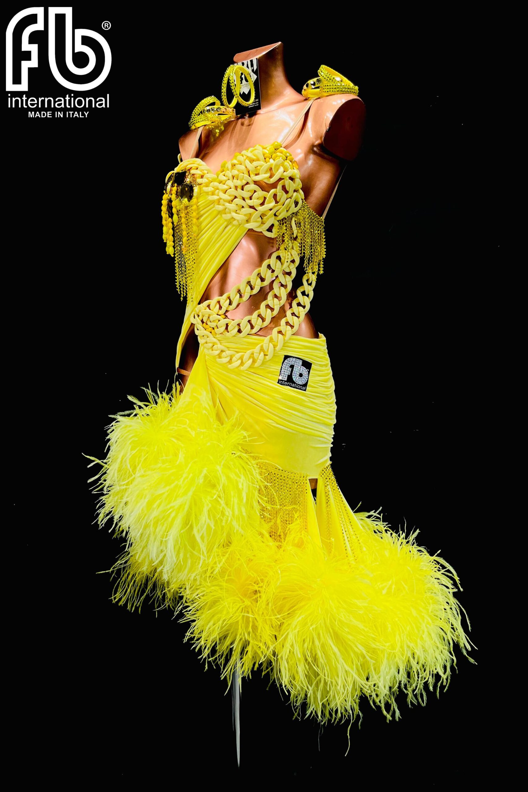 Abito da donna per danze latine in velluto giallo drappeggiato con boa di piume sull’orlo della gonna e ricco ricamo realizzato con pietre, catene, fili di perline e rete di strass. Look completato dalla fascia per la testa abbinata.